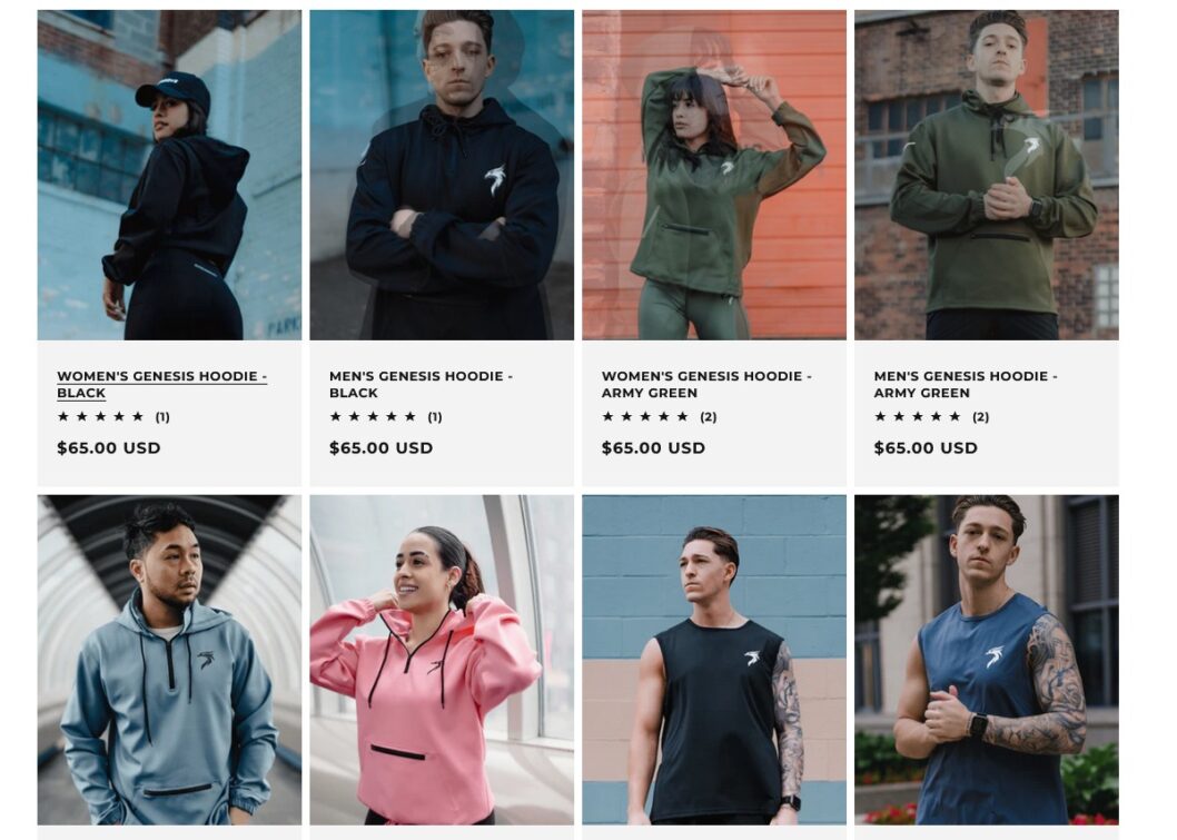 The product line reflects this mentality through its sale of men’s and women’s athletic shirts, tank tops, hoodies (including theGenesis Hoodies collection), performance shorts, biker shorts, leggings, sports bras, and hats. Each piece features symbolism representing transformation. The Phoenix rising from ashes is a recurring motif.